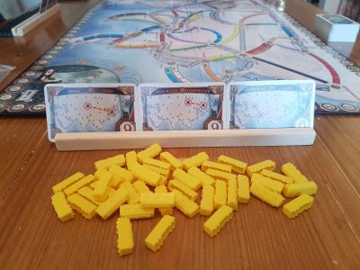 The changes are present from the very start of the game. Each member of a team gets 27 trains of their respective colour. Note this expansion comes with some additional trains of each colour to allow for 27 each. This pile of trains is what individual players must claim routes with instead of there being a central allocation for the team. The next change to how the cards are used and drawn. Whenever a player draws train cards during play one is placed onto the team’s card holder and one into that player’s hand. The cards on the card holder are then available to be used by either team member.