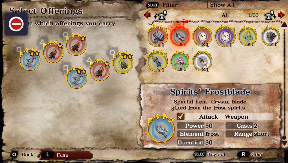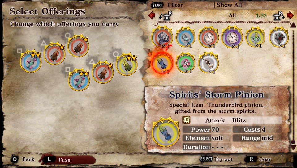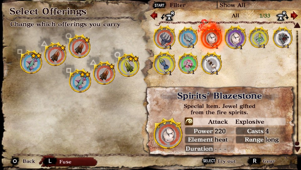 Spirits’ Heart (demo reward) – 330 attack, 2 casts, 30 second duration vs Large version – 380 attack, 3 (upgradable to 6) casts with a 40 second duration