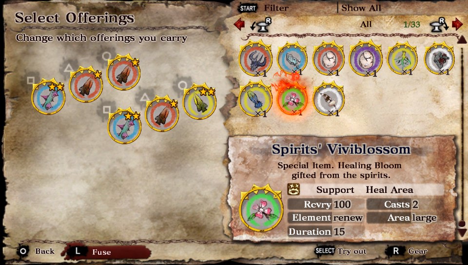 Spirits’ Viviblossom – 100 recovery, 2 casts, large, 15 second duration vs Healing Bloom (large version) – 90 recovery, 6 (upgradable to 9) casts, large, 16 second duration