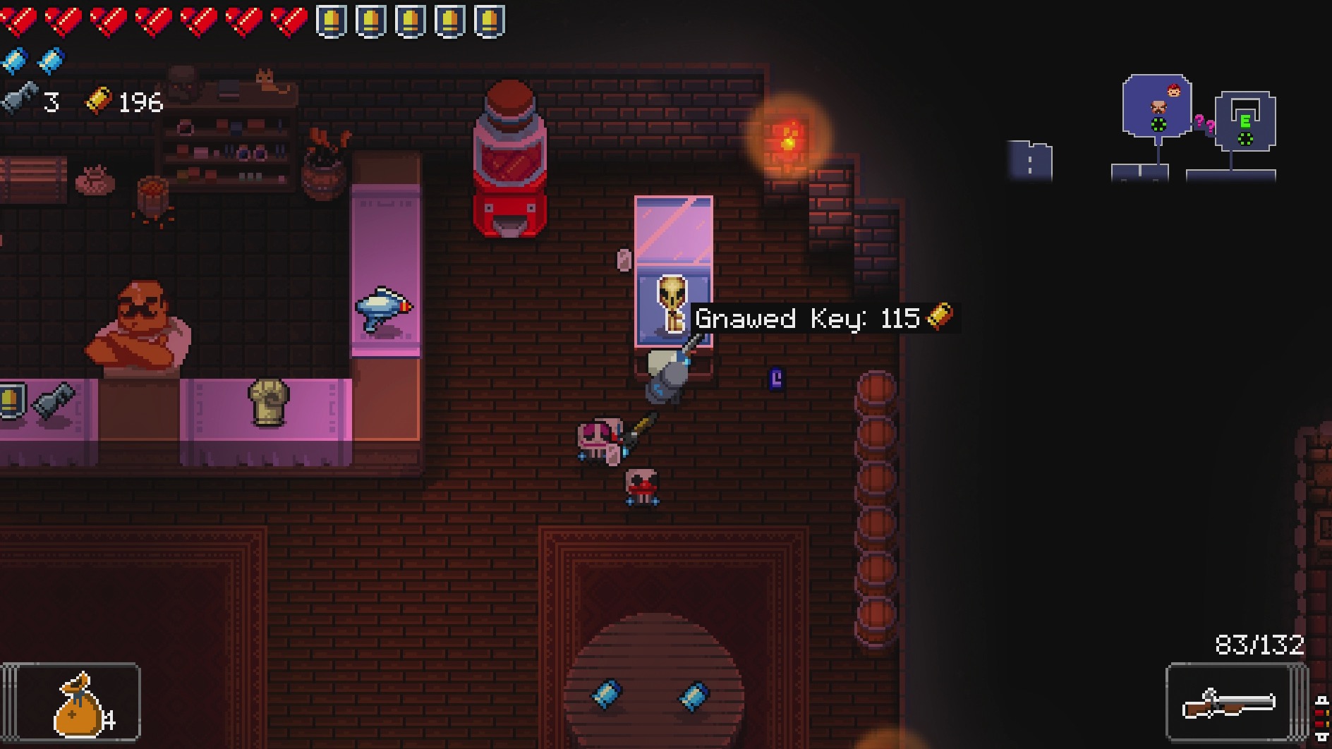The gnawed key required 1000 to buy, though it’s a cumulative amount. So, one run you can contribute 50, another 300 and so forth. The best way to get it is to unlock the vampire on the second floor and after finishing everything besides the boss, unless you’re confident in your skills, and then trade all your health for cash. This will give you like 24 per half heart, making it an easy 100 or so towards the key. I would then donate it, piss off the shop keeper to unlock a Payday item and then die, repeating it until the key is cheap enough to buy. The last trick is to lower the price to something you can pay regardless of what happens and then wait for a decked out run. If you do purchase it and fail, it will be sold for the more reasonable price of 120 or so. You can also steal it if that is easier.