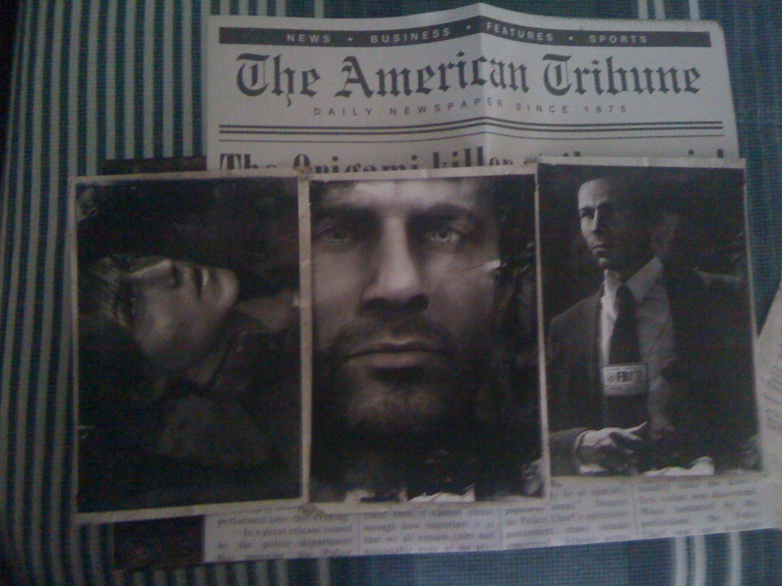 Wondering what’s inside the box? Well, in the box, you will find post cards of the photos that will be appearing in the game, a newspaper with the Origami Killer headlines, and of course the final build of the game. With that also comes with a box and when you open it, it says, “Are you prepared to suffer to save your son?” Hell yeah I am..