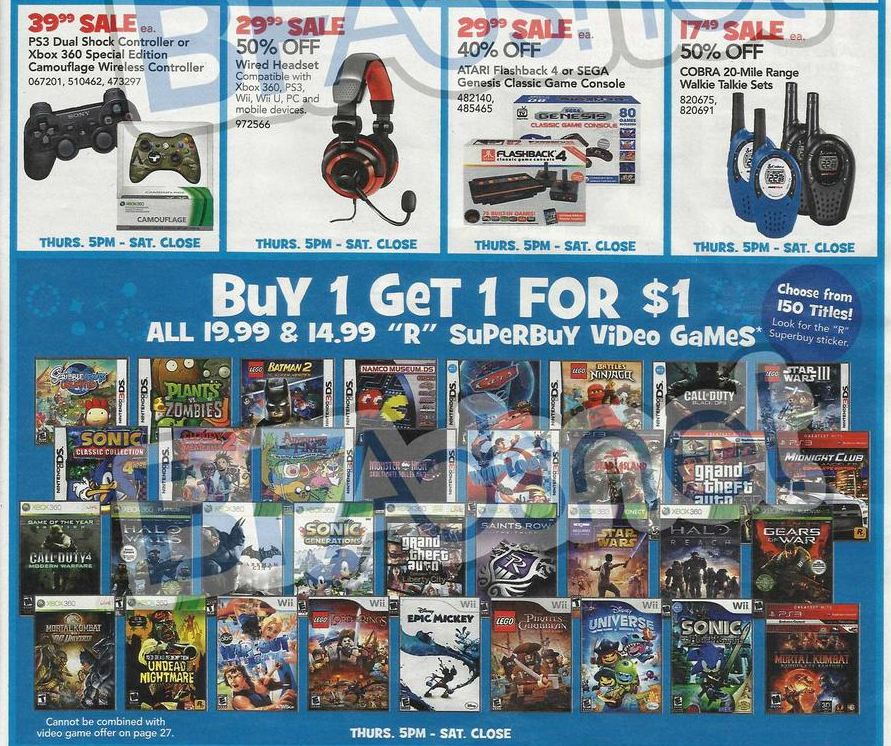 Today, thanks to BFads.net, we have scans of the Toys R Us flyer for Black Friday. The sale that is likely to attract the most attention is their Buy 1 Get 1 40% off on all video games, which could be very useful with new games for both the PlayStation 4 and Xbox One. On the cheaper end of games, they will be having their $14.99 and $19.99 “R” Superbuy video games at Buy 1 Get 1 for $1. This actually has some decent games on the list, so it’s worth checking out.