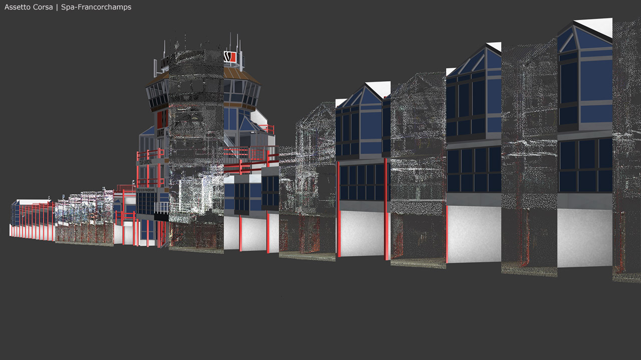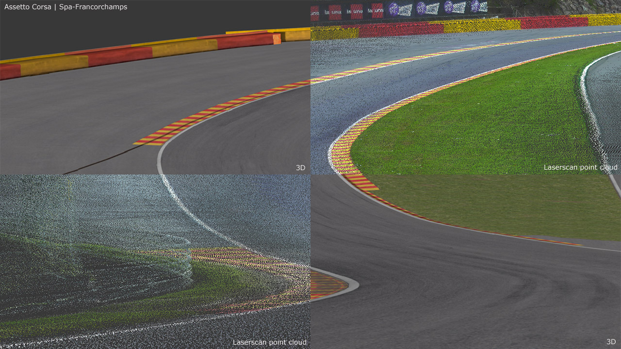 A few pictures have also been released for the work in progress Spa-Francorchamps circuit. The images show a comparison between the ‘laserscan’ points cloud of the track and the 3D model based on it.