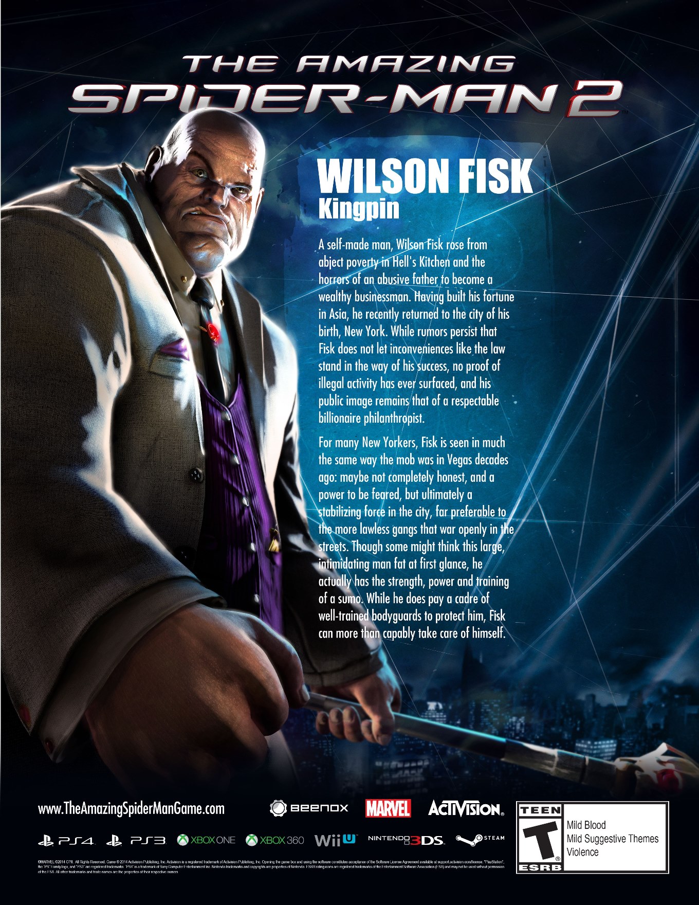 Kingpin will be in the video game of The Amazing Spider-Man 2. He’s not in the movie, but should prove to be a threat in the game. He’s been revealed before to be a boss. The Black Cat is also featured. She too isn’t in the movies, but is in the game. Kraven the Hunter is the other video game character.
